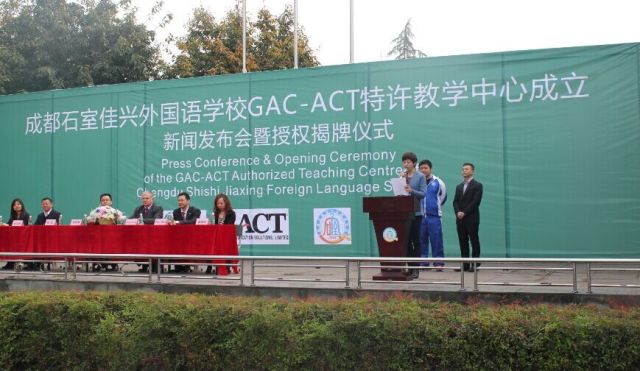 2015年4月10日,成都石室佳兴外国语学校举行了热烈而隆重的GAC-ACT特许教学考试中心成立揭牌仪式,四川省成都市唯一的一所由中学承办的ACT考点由此建立。